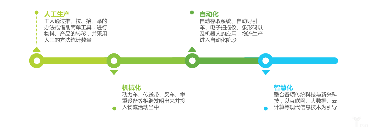 艾瑞咨詢發(fā)布《2017年中國物流科技行業(yè)研究報告》,報告指出:物流業(yè)的發(fā)展經(jīng)歷了人工生產(chǎn)、機械化、自動化再到智慧化的歷程。人工生產(chǎn)的比例逐漸降低,物流作業(yè)過程中的設備和設施逐步自動化,但總體上與美國、德國等西方發(fā)達國家相比差距較大。工業(yè)4.0的提出,強調利用物聯(lián)信息系統(tǒng)將生產(chǎn)中的供應、制造、銷售信息數(shù)據(jù)化、智慧化,最后達到快速、有效、個性化的產(chǎn)品供應。對于物流科技而言,即整合傳統(tǒng)和新興科技,以互聯(lián)網(wǎng)、大數(shù)據(jù)、云計算、物聯(lián)網(wǎng)等現(xiàn)代信息技術提升物流智能化程度,增強供應鏈柔性。