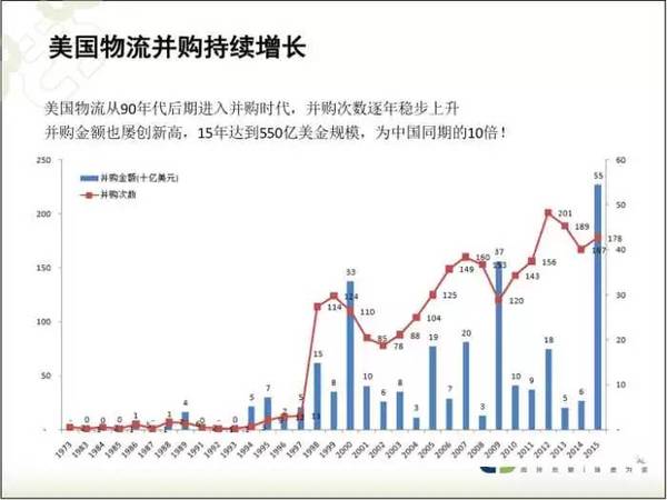 美國物流行業從90年代初開始進入并購時代,并購次數、金額逐年上升。從90年代初開始一直到現在,美國每年都有上百起并購案例發生,每年的并購交易額都超過百億美元。